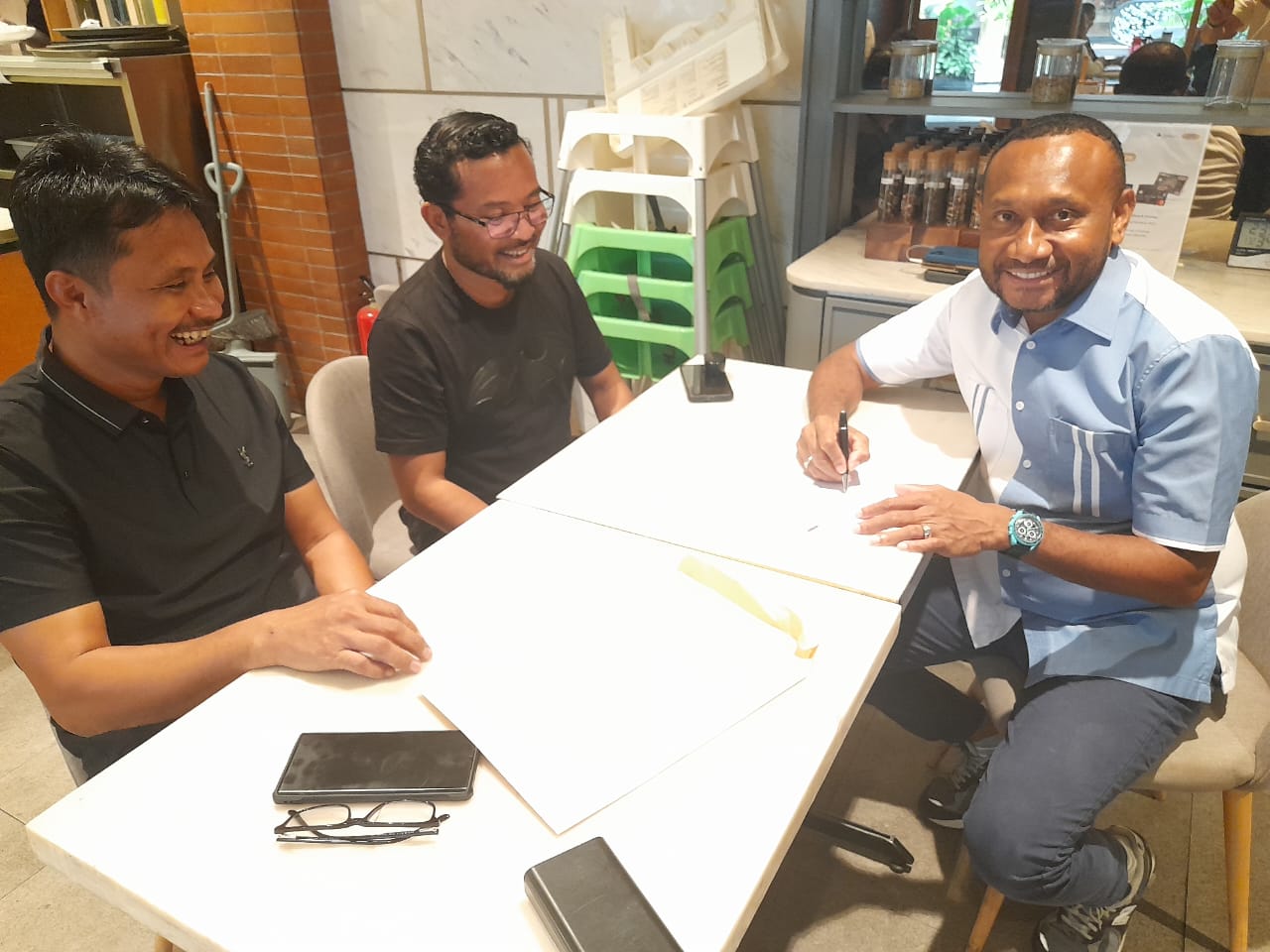 JAKARTA-Dua Komisaris PSBS Biak Yan Permenas Mandenas dan Jimmy Carter Rumbarar Kapissa secara resmi menandatangani sirkuler surat pengembalian PSBS kepada masyarakat Biak.