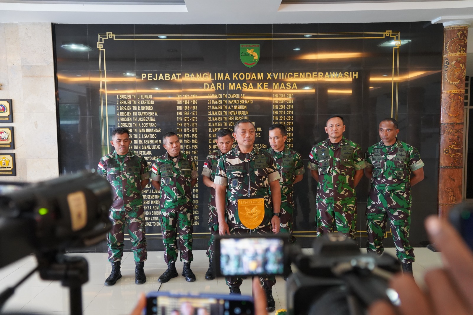 Hadir mendampingi konferensi pers tersebut Kasdam XVII/Cen Brigjen TNI Hariyanto, Kapoksahli Pangdam XVII/Cen Brigjen TNI Brigjen TNI Achmad Fauzi, S.I.P., M.M., Staf Ahli Pangdam XVII/Cen (Bidang Mensishanneg) Kolonel lnf Joao Xavier Baretto Nunes, S.E., M.M., Asintel Kasdam XVII/Cen Kolonel Inf Luhut Bernandus Sidabariba, S.I.P., M.M., Asops Kasdam XVII/Cen Kolonel Inf Marianus Moat Lukas Sadipun, Aster Kasdam XVII/Cen Kolonel Inf Mukhamad Akbar, S.E.(*)