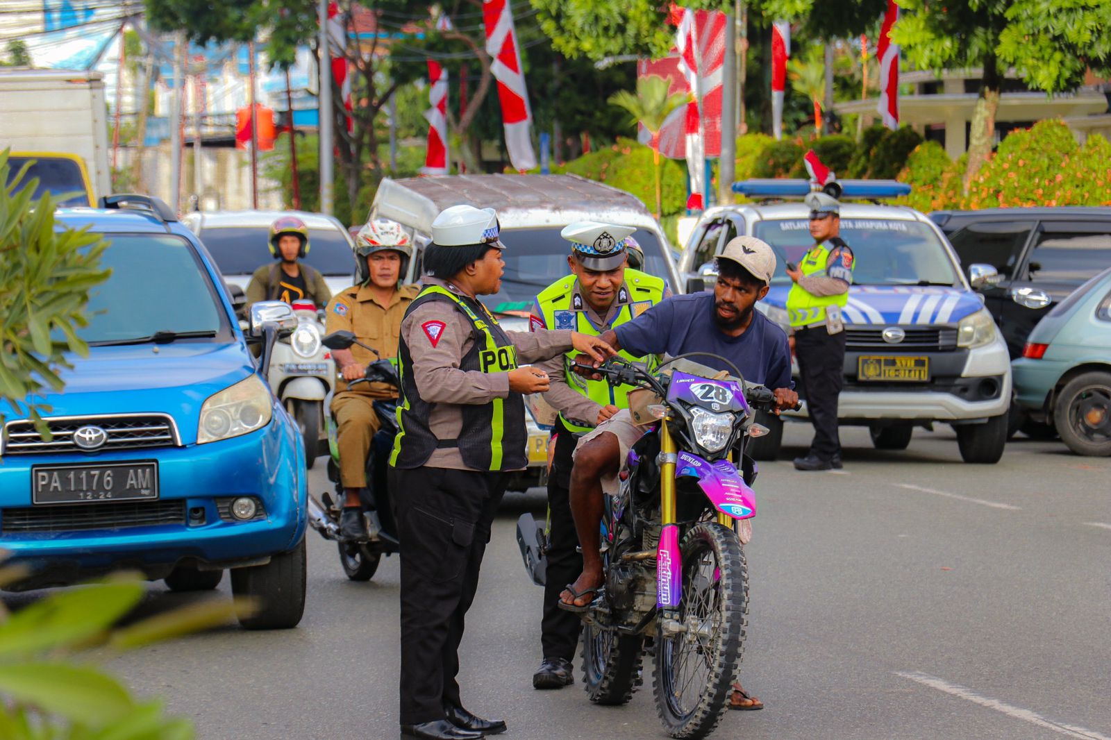 JAYAPURA- Sebanyak 57 pengendara roda dua terjaring dalam Operasi Zebra Cartenz 2023 di hari kedelapan yang dilaksanakan oleh Satuan Lalu Lintas Polresta Jayapura Kota di Jalan Ahmad Yani tepatnya didepan Mapolresta, Senin (11/9) sore.