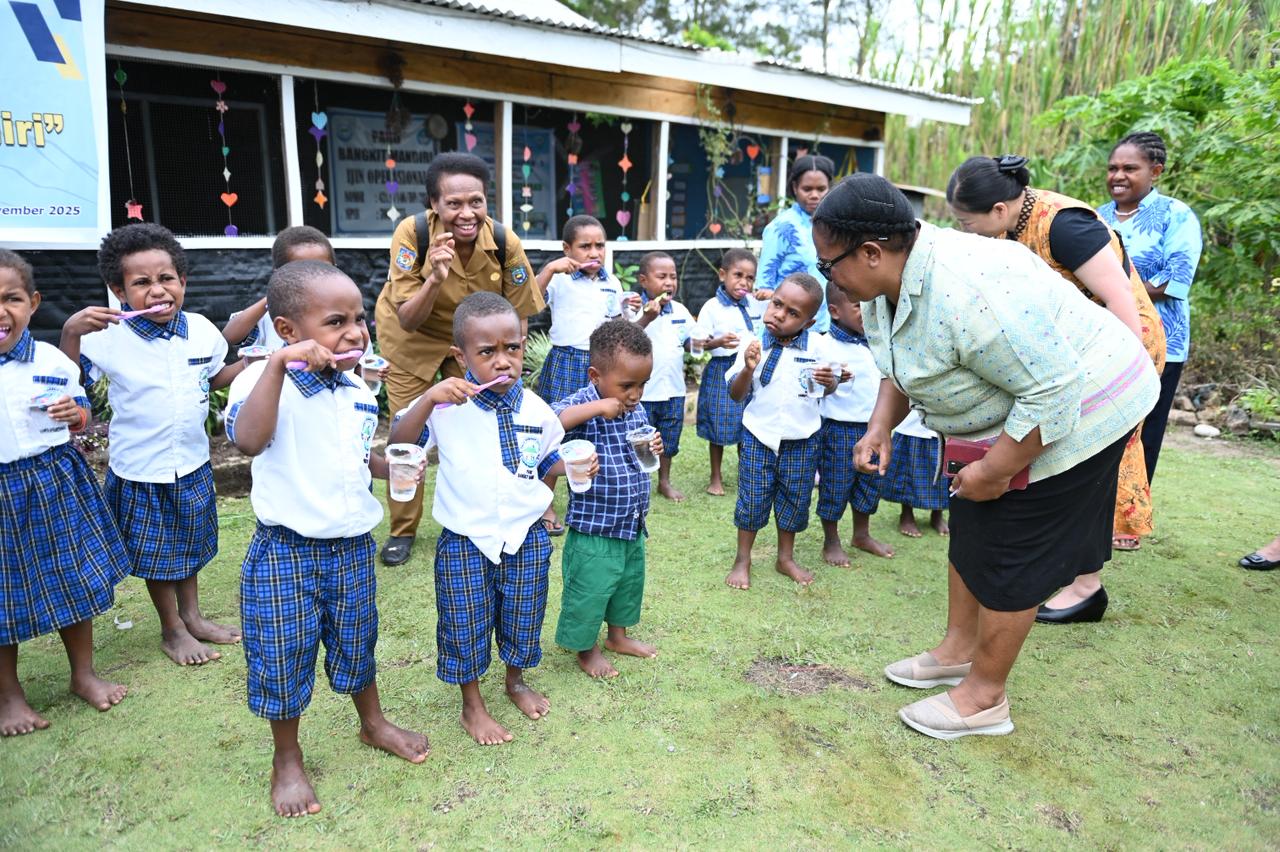 Wamena, 11 November 2025 — Dharma Wanita Persatuan (DWP) Unsur Dinas Pekerjaan Umum dan Perumahan Rakyat (PUPR) Provinsi Papua Pegunungan melaksanakan kegiatan sosial bertajuk Berbagi Kasih di PAUD Mandiri Sinakma, Wamena. Dalam kunjungan tersebut, para ibu DWP menyerahkan bantuan berupa alat tulis dan permainan edukatif kepada anak-anak, sekaligus memberikan edukasi mengenai Perilaku Hidup Bersih dan Sehat (PHBS), termasuk cara menyikat gigi yang benar.