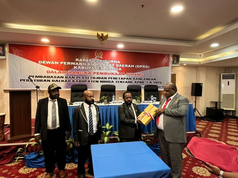 KENYAM – Dewan Perwakilan Rakyat Daerah (DPRD) Kabupaten Nduga menggelar Rapat Paripurna dalam rangka pembukaan sidang pembahasan dan persetujuan Rancangan Peraturan Daerah Kabupaten Nduga tentang APBD Tahun Anggaran 2025 pada Jumat, 20 Desember 2024.