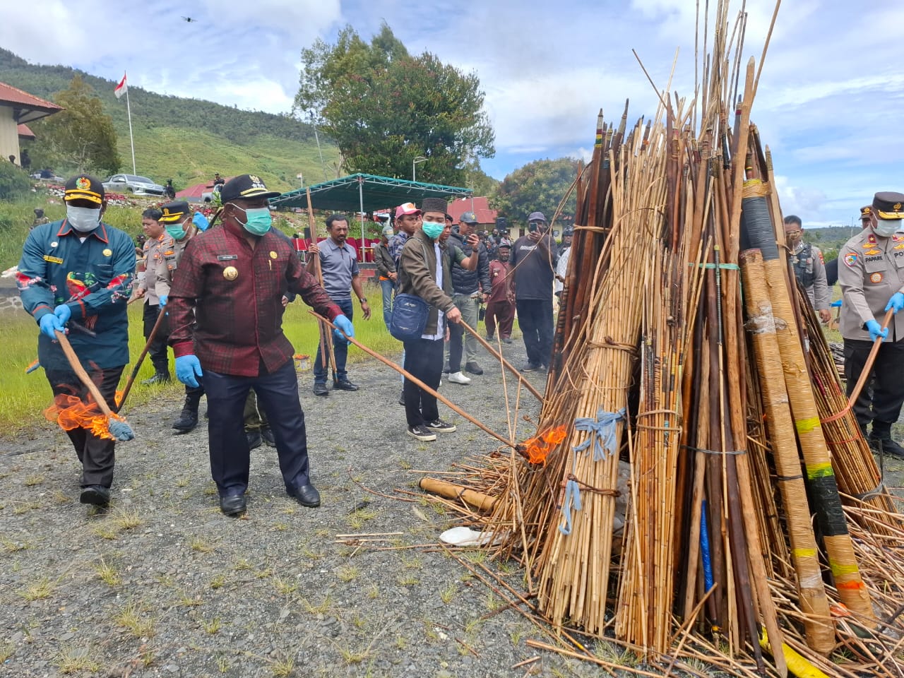 Pemusnahan alat perang itu, dilakukan langsung oleh Kapolda Papua Brigjen Pol Alfred Papare bersama Danrem 173/PVB Brigjen TNI Fritz Willem Ricard Pelamonia, Pj Bupati Puncak Jaya Yopi Murib, Kapolres dan Dandim 1714 Puncak Jaya, Sekda Puncak Jaya, Tumiran, yang disaksikan tokoh agama, tokoh masyarakat dan perwakilan kubu paslon 01 dan 02.
