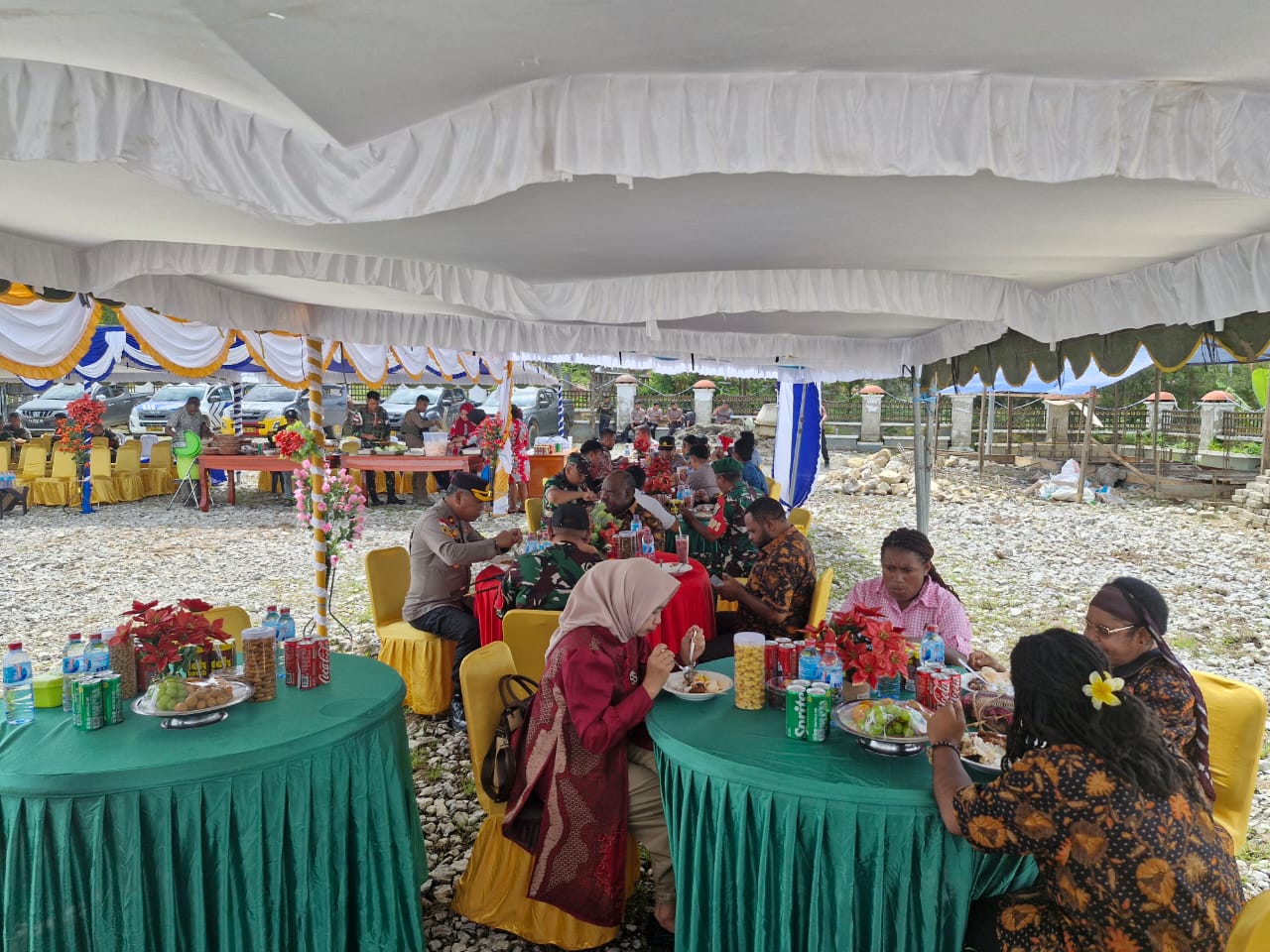 Para tamu yang hadir disambut dengan ramah oleh tuan rumah. Hidangan khas seperti papeda, ikan bakar, sayur lilin, dan ubi rebus tersaji di meja panjang, menambah kehangatan suasana. Anak-anak tampak riang bermain di halaman, sementara para orang tua dan tokoh masyarakat berbincang akrab dengan para pejabat daerah.