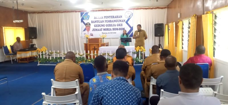 WAMENA- Mendukung pembangunan tempat ibadah GKII Jemaat Moria Hom-hom Wamena Kabupaten Jayawijaya, Bupti Jayawijaya Jhon R. Banua SE. M.SI melalui Pemerintah Daerah Kabupaten Jayawijaya menyerahakan bantuan uang Rp. 300 juta, pada selasa (25/7/23).Bupati Jhon Banua, SE. M.Si mengatakan bantuan tersebut merupakan bantuan pertama untuk pembangunan gedung Gereja Moria. Selanjutnya kata Bupati akan tetap menjadi perhatiannya.