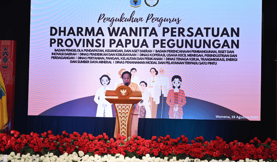 Wamena, 19 Agustus 2025 — Pemerintah Provinsi Papua Pegunungan menegaskan komitmennya untuk memperkuat peran Dharma Wanita Persatuan (DWP) sebagai mitra aktif dalam mendukung pembangunan daerah. Penegasan ini disampaikan oleh Penjabat Sekretaris Daerah, Drs. Wasuok D. Siep, saat membuka acara pengukuhan tujuh unsur pelaksana DWP dari berbagai Organisasi Perangkat Daerah (OPD) di lingkungan Pemprov Papua Pegunungan. Kegiatan tersebut berlangsung di Hotel Baliem Pilamo, Wamena, dan dihadiri oleh jajaran OPD, tokoh perempuan, serta tamu undangan dari berbagai kalangan.