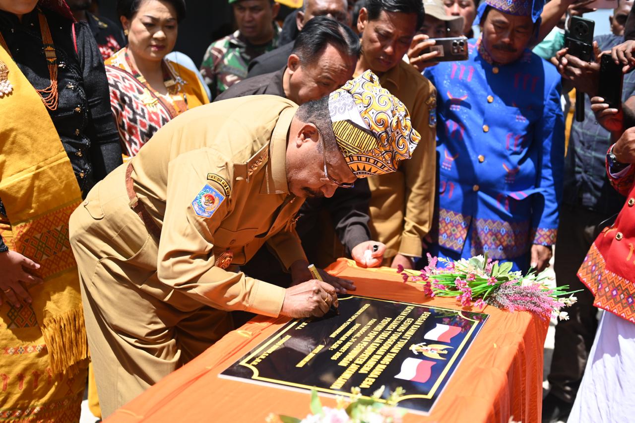 Wamena, 30 Maret 2026-Gubernur Papua Pegunungan, John Tabo, didampingi Bupati Jayawijaya Athenius Murib, secara resmi meresmikan Gedung Tongkonan Wamena pada 30 Maret 2026. Peresmian tersebut ditandai dengan penandatanganan prasasti sebagai simbol penggunaan gedung secara resmi.