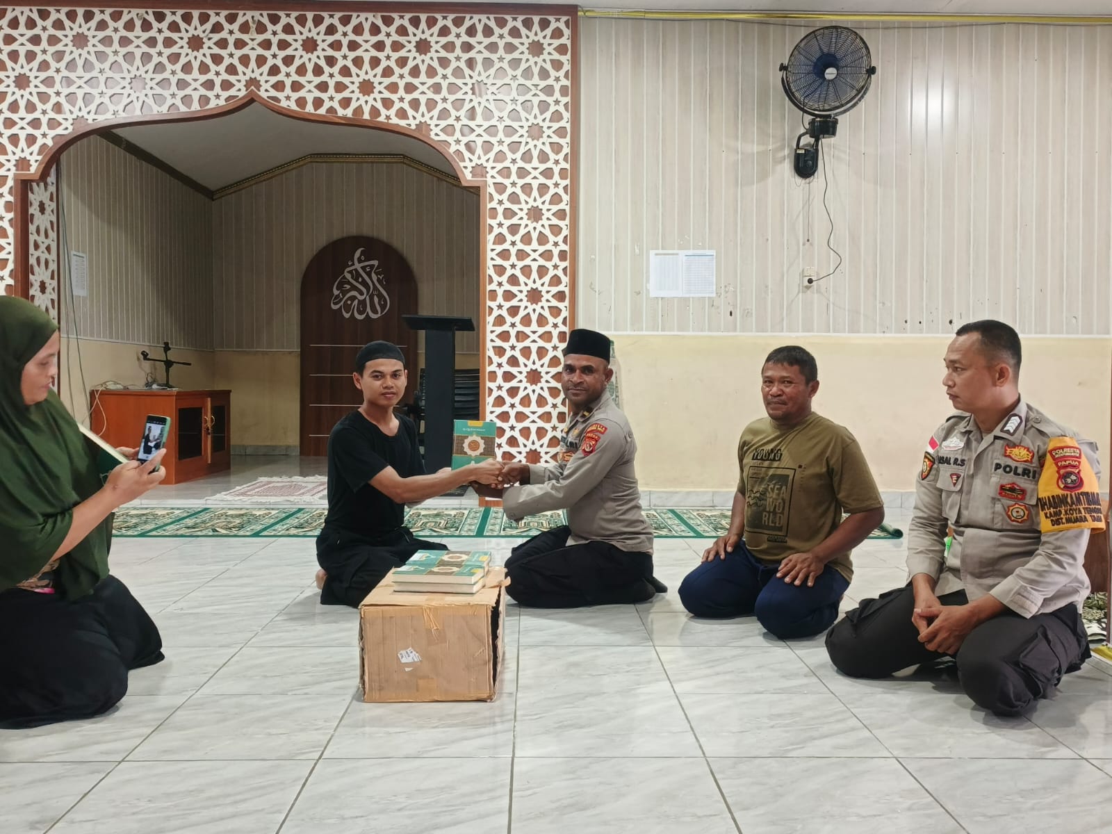 Penyerahan Kitab Suci Al-Qur’an tersebut diserahkan langsung Kanit Binmas Polsek Muara Tami Ipda Yanto Rumbruren didampingi Bhabinkamtibmas Aipda Obeth Aronggear dan Bripka Faisal dan diterima oleh Ustadz Muhammad Ihsan selaku perwakilan Pondok.