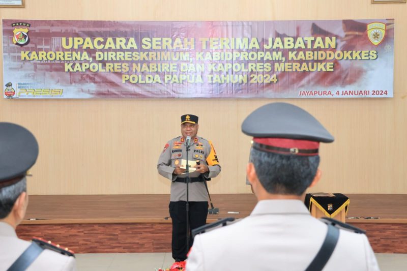 JAYAPURA – Kapolda Papua, Irjen Pol. Mathius D. Fakhiri, S.I.K., memimpin pelaksanaan Serah Terima Jabatan (Sertijab) dan Pisah Sambut empat Pejabat Utama dan dua Kapolres jajaran Polda Papua. Kegiatan digelar Kamis (4/1/2024) di Aula Rastra Samara Polda Papua.