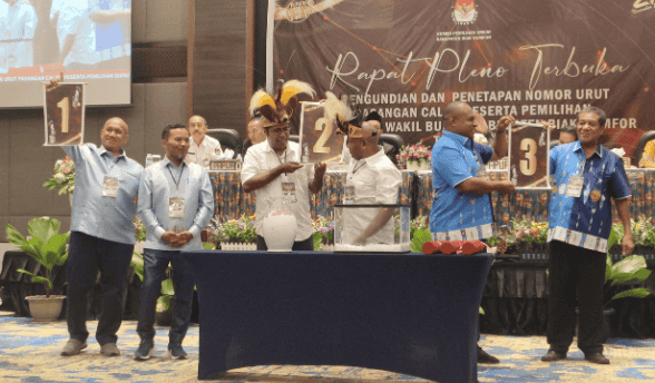 BIAK-KPU Biak Numfor telah menetapkan nomor urut dari tiga pasangan calon Bupati dan Wakil Bupati Biak Numfor, pada kontestasi Pilkada 2024, di Hotel Swiss-Bel, Senin (23/9). Penetapan dilakukan pada Rapat Pleno Terbuka Pengundian dan Penetapan Nomor Urut pasangan calon Peserta Pemilihan Bupati dan Wakil Bupati Kabupaten Biak Numfor Tahun 2024.