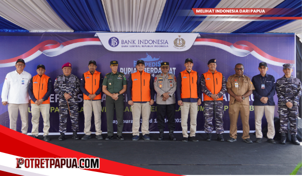JAYAPURA-Kepala Perwakilan Bank Indonesia Provinsi Papua, Faturachman bersama dengan Komandan Lantamal X Jayapura, Brigjen TNI (Mar) Ludi Prastyono, M. Tr. Opsla dan Pj. Sekda Provinsi Papua, Y. Derek Hegemur, SH., MH. serta jajaran Forkopimda dan Pimpinan Perbankan Provinsi Papua melepas tim Ekspedisi Rupiah Berdaulat (ERB) Papua tahun 2024 di Satrol Lantamal X Jayapura pada Senin, 13 Mei 2024.
