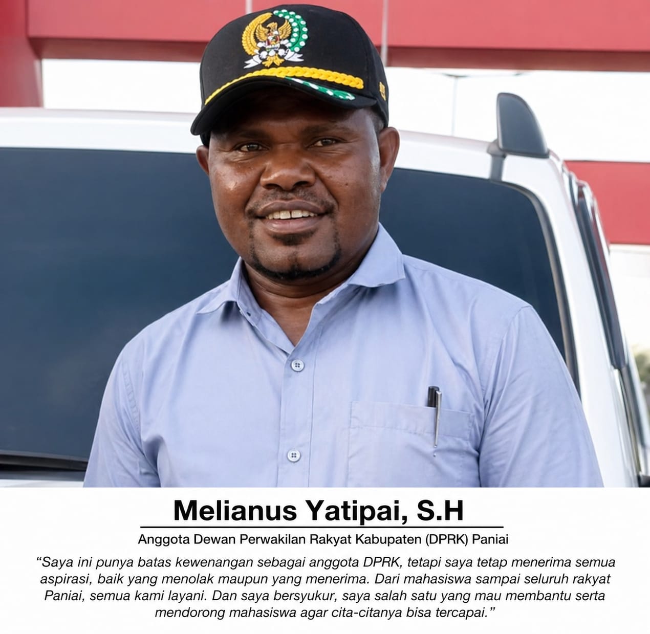 “Saya ini punya batas kewenangan sebagai anggota DPRK, tetapi saya tetap menerima semua aspirasi, baik yang menolak maupun yang menerima. Dari mahasiswa sampai seluruh rakyat Paniai, semua kami layani. Dan saya bersyukur, saya salah satu yang mau membantu serta mendorong mahasiswa agar cita-citanya bisa tercapai,” ungkapnya.