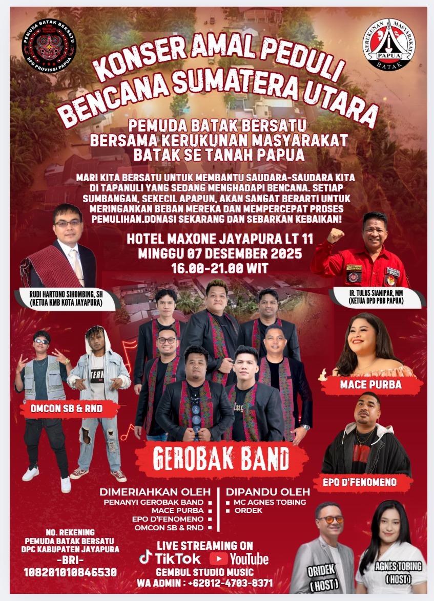 KOTA JAYAPURA, 6 Desember 2025 – DPD Pemuda Batak Bersatu (PBB) Provinsi Papua bersama Kerukunan Masyarakat Batak (KMB) Se-Tanah Papua menggelar konser amal bertajuk “Peduli Bencana Sumatera Utara. Kegiatan ini akan berlangsung di Hotel Max One Jayapura Kota Jayapura, Lantai 11, Minggu 7 Desember 2025.