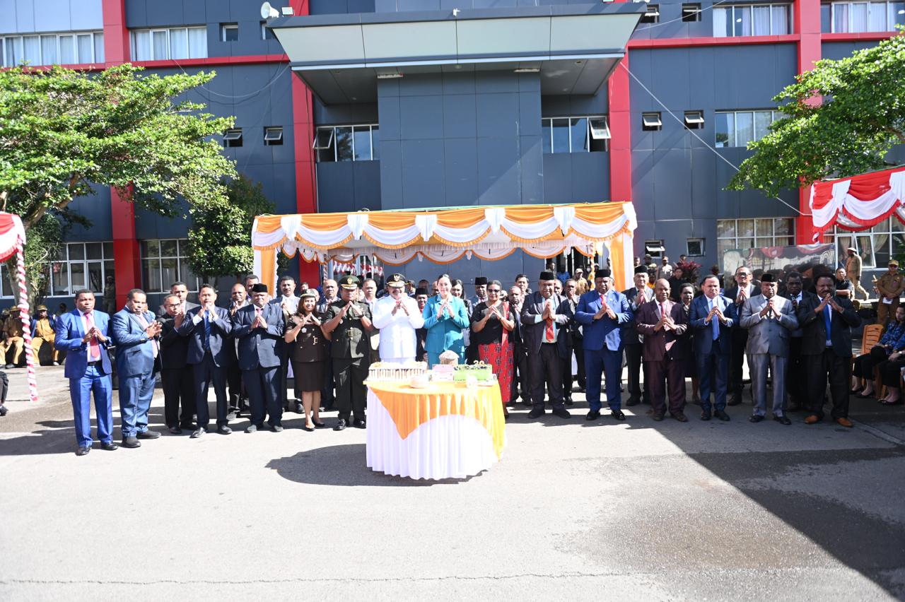 Wamena — 27 April 2026. Suasana penuh syukur dan kebersamaan mewarnai halaman Kantor Gubernur Papua Pegunungan, usai pelaksanaan upacara peringatan Hari Otonomi Daerah (OTDA) ke-30, Senin (27/4). Pemerintah Provinsi Papua Pegunungan menggelar perayaan sederhana namun bermakna untuk menandai satu tahun kepemimpinan Gubernur John Tabo dan Wakil Gubernur Ones Pahabol.