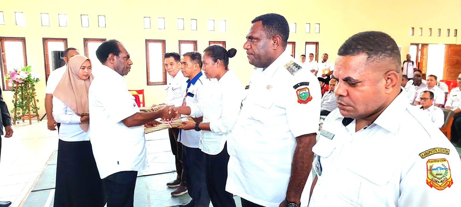 KEEROM-Bupati Keerom Piter Gusbager bersama Wakil Bupati Keerom Wahfir Kosasih dan Sekda Keerom Trisiswanda Indra membagikan DPA (Daftar Pelaksanaan Anggaran) Tahun Anggaran 2024 kepada seluruh SKPD yang ada di Kabupaten Keerom di Gedung Peamuka, Rabu (31/1/2024).