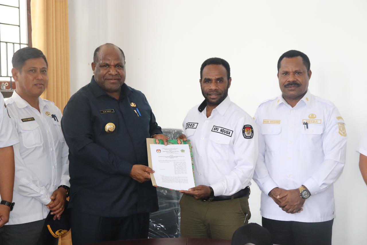 Penyerahan dilaksanakan di Ruang Rapat Bupati Nduga, Rabu (12/6/2024) oleh PJ Bupati Nduga, Elai Giban, SE, MM, Ketua KPU Nduga Yosekat Kogoya, Dandim 1706 , Kapolres Nduga dan Pejabat eselon II di lingkungan Sekretariat Daerah Kabupaten Nduga