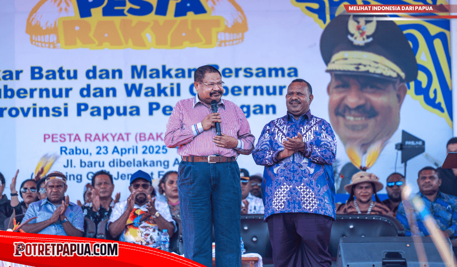 SENTANI-Kabupaten Jayapura – 23 April 2025 , Gubernur Papua Pegunungan, Dr. (HC) John Tabo, SE.,M.BA., dan Wakil Gubernur Dr. Ones Pahabol, SE.,MM., menggelar syukuran atas pelantikan mereka sebagai pemimpin resmi Provinsi Papua Pegunungan untuk masa jabatan 2025–2030 . Acara ini berlangsung di Sentani, Kabupaten Jayapura , dengan menghidupkan tradisi budaya bakar batu dalam balutan pesta rakyat sebagai simbol persatuan, syukur, dan kebersamaan.