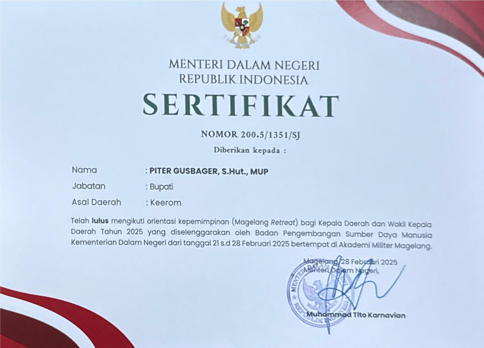 KEEROM – Setelah dinyatakan lulus dari kegiatan retret kepala daerah di Akademi Militer (Akmil) Magelang, Bupati Kabupaten Keerom, Piter Gusbager,…