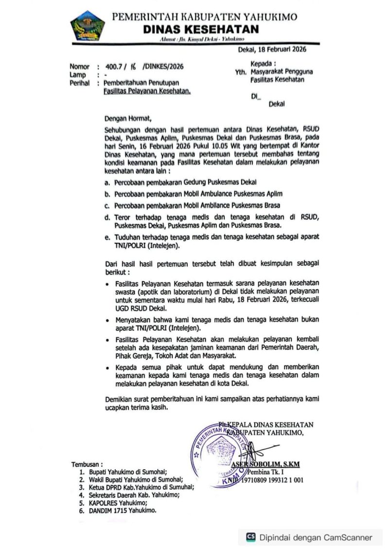 Kepala Dinas Kesehatan Yahukimo, Ase Rusobolim, S.KM, melalui edaran Pemberitahuan Penutupan Fasilitas Pelayanan Kesehatan Yahukimo Nomor : 400.7 / K /DINKES/2026 yang diperoleh redaksi menegaskan bahwa seluruh fasilitas kesehatan, termasuk apotek dan laboratorium swasta, ditutup sementara, kecuali UGD RSUD Dekai yang tetap melayani kasus darurat.