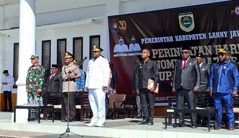 TIOM, 27 April 2026 – Pemerintah Kabupaten Lanny Jaya menggelar upacara Peringatan Hari Otonomi Daerah ke-XXX Tahun 2026 di halaman Kantor Bupati Lanny Jaya. Upacara ini dipimpin langsung oleh Wakil Bupati Lanny Jaya, Fredi Ginia Tabuni ST, mewakili Bupati Lanny Jaya, Aletinus Yigibalom S.Pd. Hadir dalam kesempatan tersebut jajaran pimpinan Pemda Lanny Jaya, ASN, serta unsur TNI/Polri, menjadikan peringatan ini sebagai momentum kebersamaan lintas sektor.