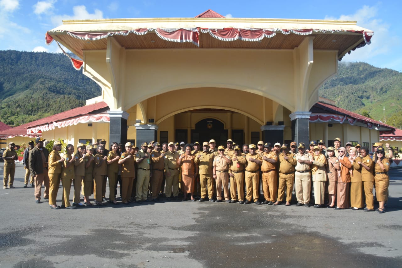 Mulia,(Senin, 28/07)_Wakil Bupati Puncak Jaya Mus Kogoya, SE pimpin apel rutin Aparatur Sipil Negara (ASN), Instansi Vertikal, Tenaga Honorer dan Ormas dilingkungan Pemerintah Kabupaten Puncak Jaya. Berlangsung Di Lapangan Apel Kantor Bupati.