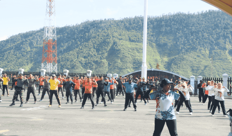 Mulia, Jumat (01/08)_ Wakil Bupati Puncak Jaya, Mus Kogoya, SE, memimpin senam jantung sehat bersama Aparatur Sipil Negara (ASN), TNI-Polri, Persit, Bayangkari, jajaran instansi vertikal, tenaga honorer, dan pimpinan ormas di lingkup Pemerintah Kabupaten Puncak Jaya. Kegiatan ini berlangsung di Halaman Kantor Bupati Puncak Jaya.
